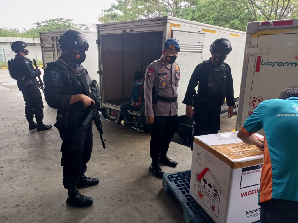 Lensa-balikpapan-/ Jajaran Batalyon A Pelopor Satbrimob Polda Kaltim, Selasa, (15/6). Mengerahkan sepuluh personel Brimob Polda Kaltim dan menurunkan kendaraan taktis dalam mengawal kedatangan dan pengiriman vaksin ke tempat penyimpanan vaksin milik Dinas Kesehatan Provinsi Kaltim.
