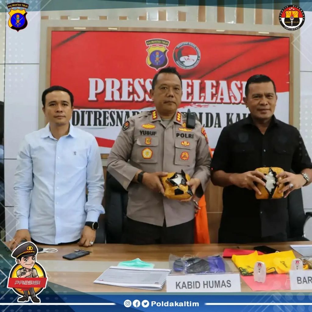 Konferensi pers tersebut dipimpin langsung oleh Kabid Humas Polda Kaltim Kombes Pol Yusuf Sutejo, S.I.K., M.T., yang didampingi Dir Resnarkoba Polda Kaltim Kombes Pol Rickynaldo, S.I.K., M.M.
