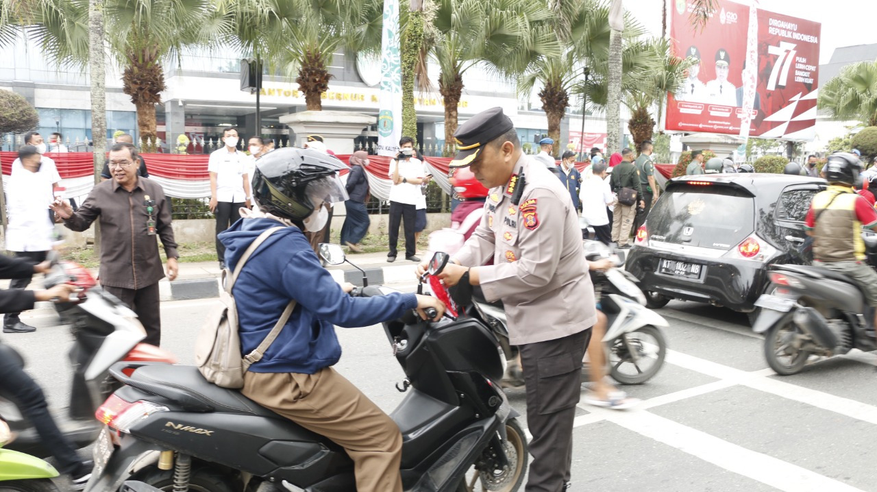 Tampak Wakil Gubernur bersama Danrem 091/ASN Brigjen TNI Dendi Suryadi dan Kabid Humas Polda Kaltim Kombes Pol Yusuf Sutejo, S.I.K., M.T. turun langsung kejalan memberikan Bendera Merah Putih kepada para pengendara yang melintas didepan kantor Gubernur Kaltim.