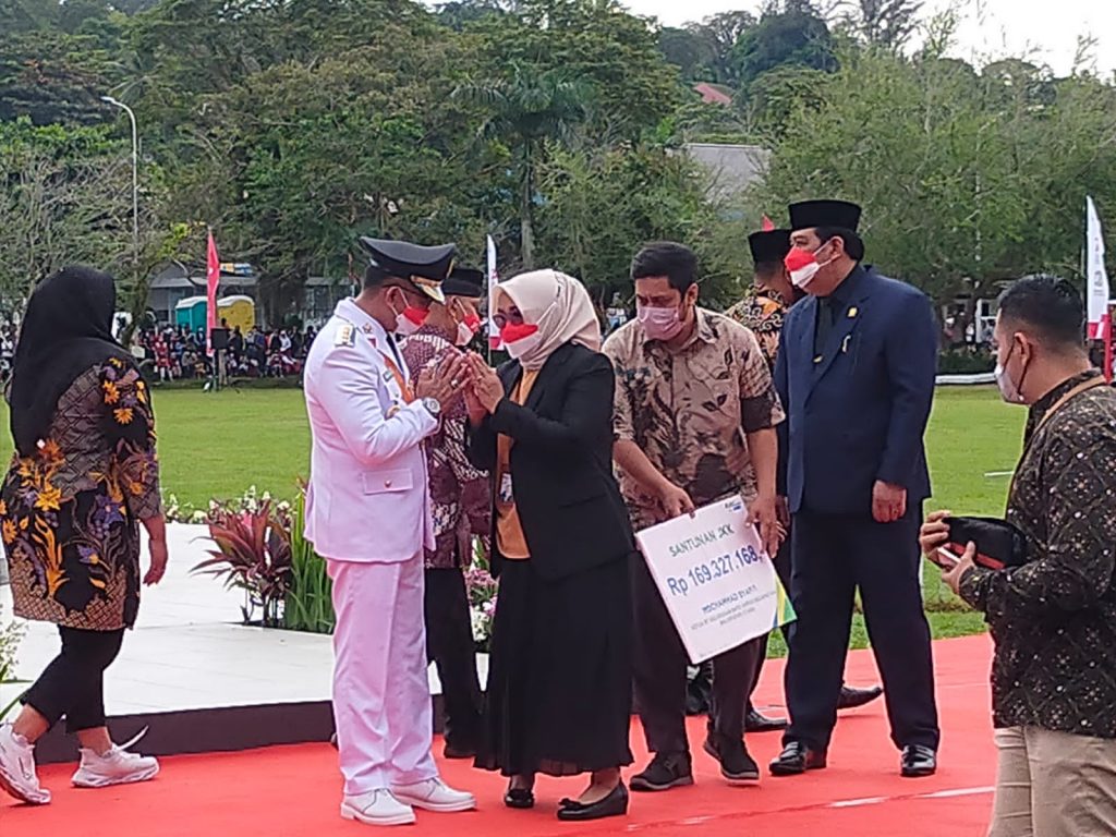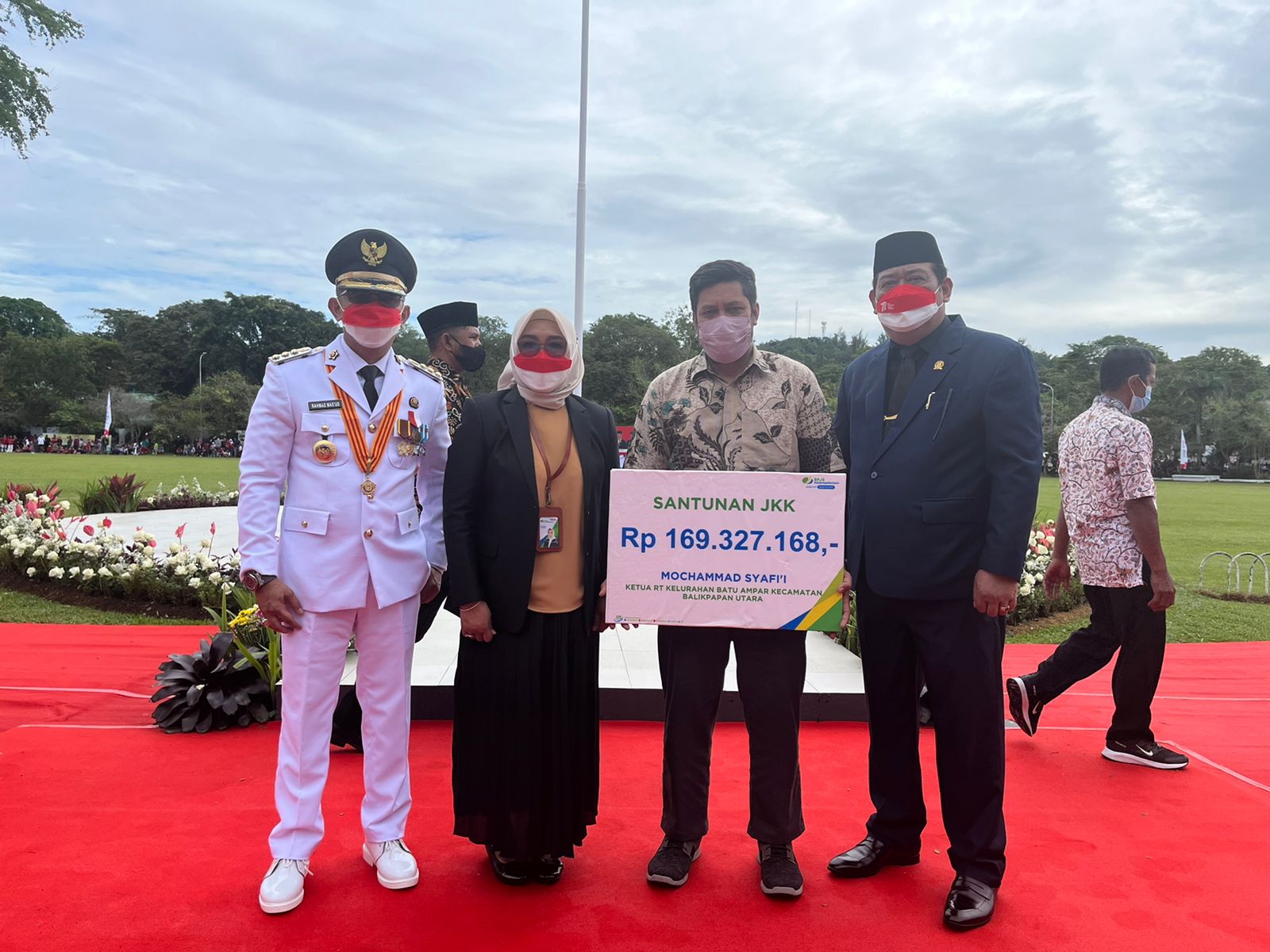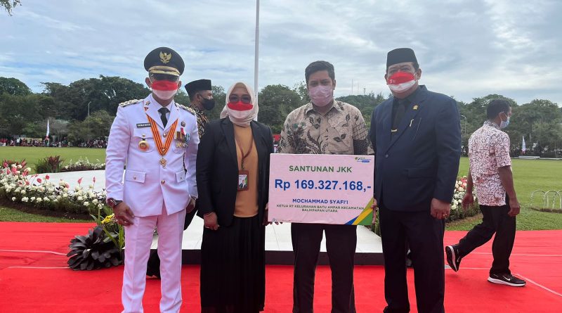 Santunan Jaminan Kematian (JKM) yang diberikan , langsung di terima oleh ibu Tri Sumei yang merupakan Istri dari Almarhum Mochammad Syafi’i bertepatan dengan HUT RI ke 77 di Lapangan Merdeka di hadapan Wali Kota Balikpapan Rahmad Mas’ud,Ketua DPRD Balikpapan Abdulloh S,Sos dan seluruh peserta upacara, serta masyarakat yang hadir.