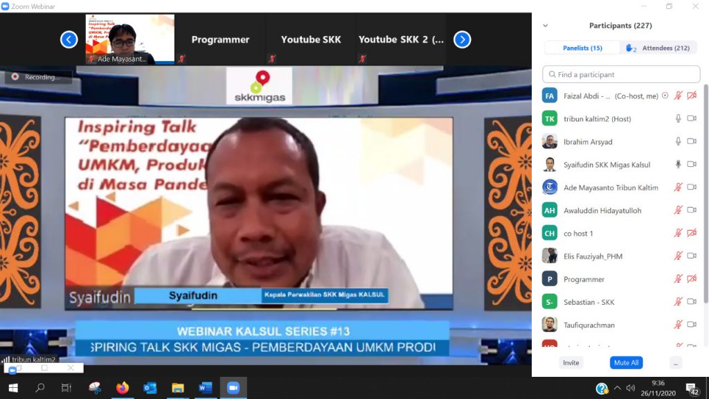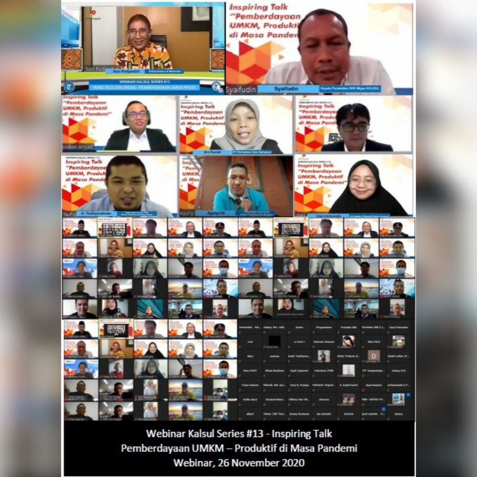 Melalui kegiatan Webinar Inspiring Talk 2020 yang dilaksanakan pada Kamis (26/11) , Satuan Kerja Khusus Pelaksana Kegiatan Usaha Hulu Minyak Dan Gas Bumi Perwakilan Kalimantan dan Sulwesi (SKK Migas Kalsul) dan Kontraktor Kontrak Kerjasama (KKKS) Kalsul ingin membangkitkan UMKM yang ada. Mengambil tema “Pemberdayaan UMKM – Produktif di Masa Pandemi”, SKK Migas ingin kembali berusaha menggerakan semangat UMKM walaupun situasi dalam keadaan sulit karena Covid-19.