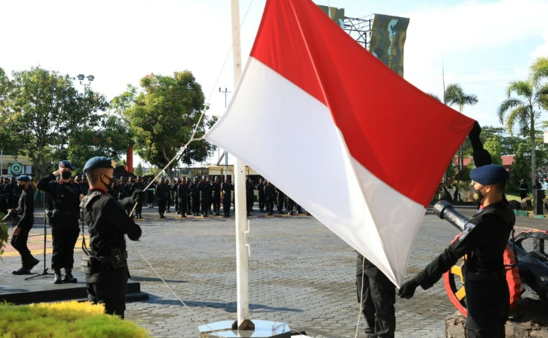Balikpapan,Danden Gegana Polda Kaltim, Kompol Sony Laway S.I.K pimpin pelaksanaan Upacara Pengibaran Bendera Merah Putih bertempat di Lapangan Makosat Brimob Polda Kaltim, Senin (18/04/2022)