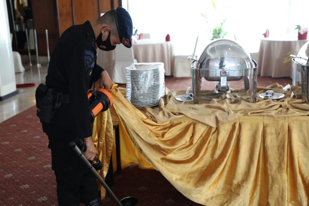 lensa-balikpapan.com/- Balikpapan, – Personil Unit Jibom Detasemen Gegana Satbrimob Polda Kaltim yang dipimpin Aipda Harmoko siap sterilisasikan Hotel Grand Senyiur Balikpapan, Jumat (11/06/2021).