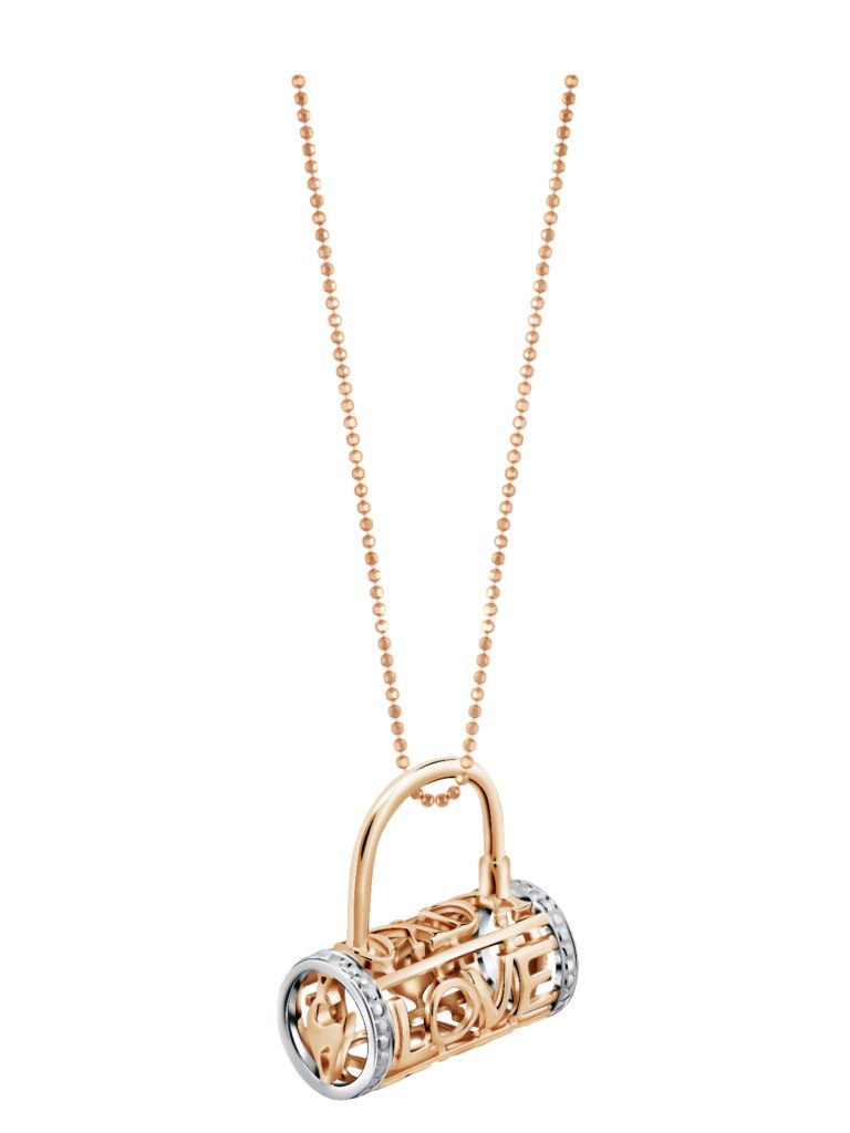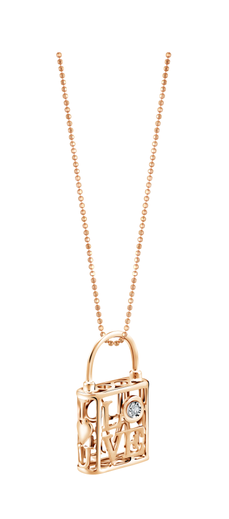 Sama seperti desain yang pertama, desain Love Lock yang kedua ini juga memilki kata “Love”. Uniknya liontin ini berbentuk gembok silinder yang mengkombinasikan emas rose gold dan white gold sehingga terlihat lebih elegan. Tak ketinggalan berlian yang disusun berderet pada sisi ujung kanan dan kirinya semakin menyempurnakan keindahan pendant berlian ini.