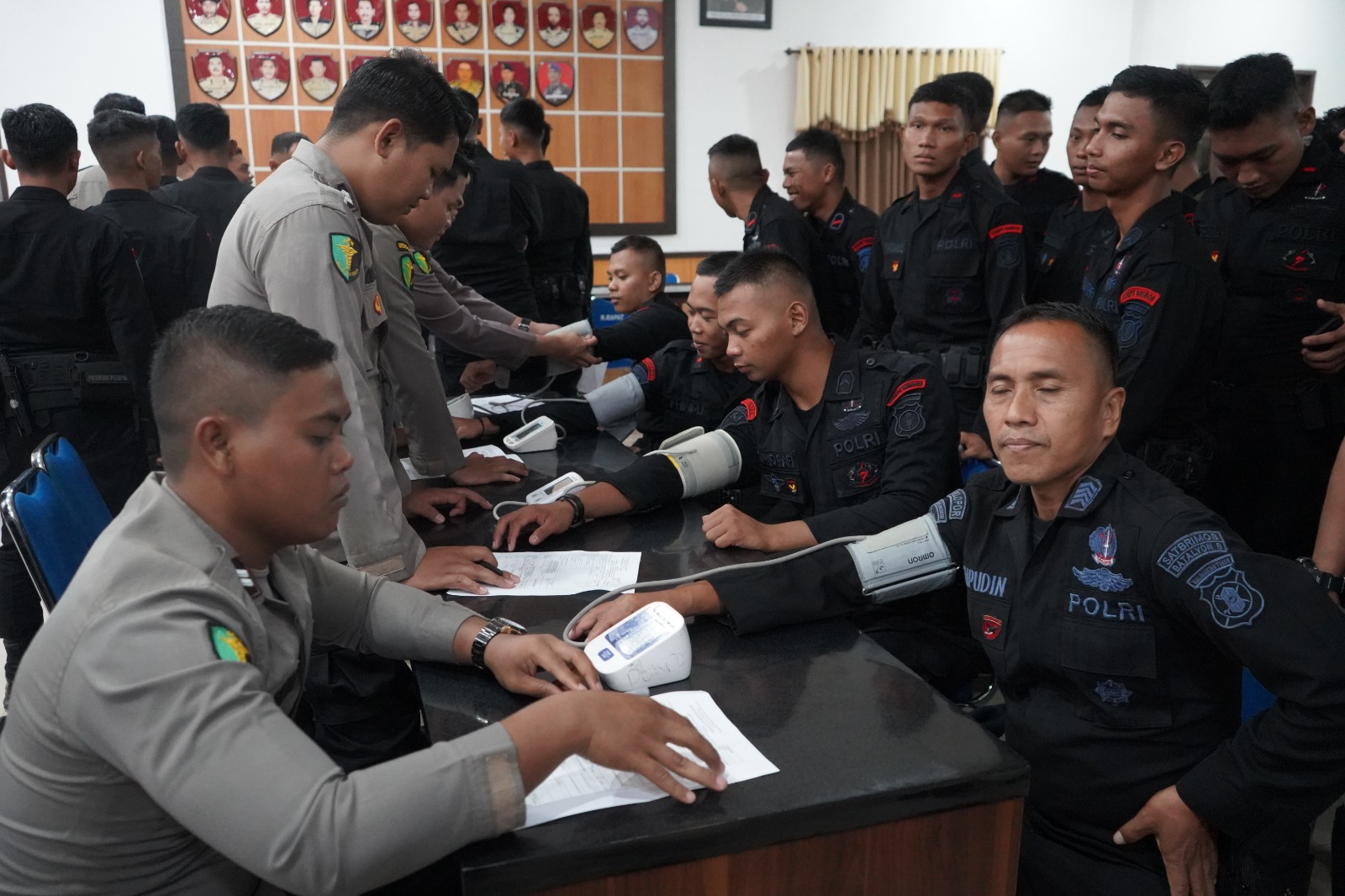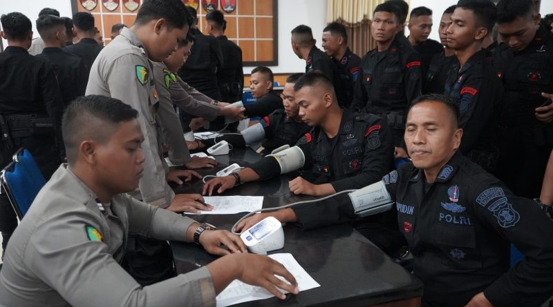 Pemeriksaan meliputi pengecekan tekanan darah, kadar gula darah, suhu tubuh, serta pemeriksaan kesehatan umum guna memastikan kondisi personel tetap prima menjelang pelaksanaan tugas pengamanan.