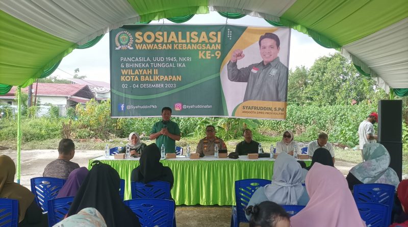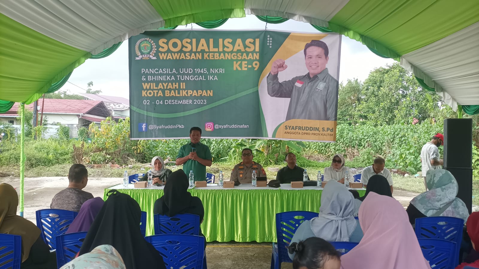 Anggota Dewan Perwakilan Rakyat Daerah (DPRD) Provinsi Kalimantan Timur (Kaltim), Syafruddin, S.Pd melakukan Sosialisasi Wawasan Kebangsaan, kepada warga RT 11 Jalan Bengawan Kelurahan Gunung Samarinda, Kecamatan Balikpapan Utara, pada hari Sabtu (2/12/2023) sore.