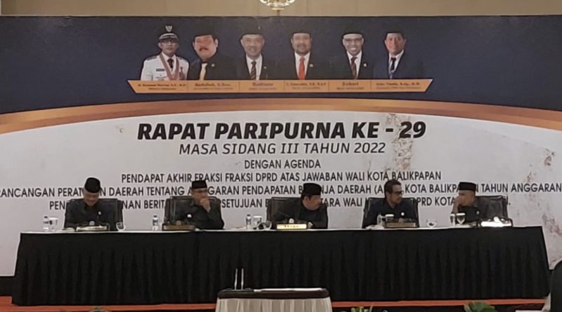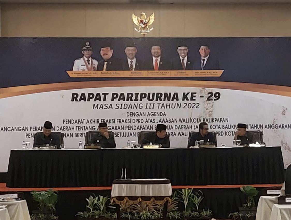 Adapun agenda Pendapat Akhir Fraksi-Fraksi DPRD atas Jawaban Wali Kota Balikpapan terhadap Rancangan Peraturan Daerah tentang Anggaran Pendapatan Belanja Daerah (APBD) Kota Balikpapan Tahun Anggaran 2023 dan Penandatanganan Berita Acara Persetujuan.