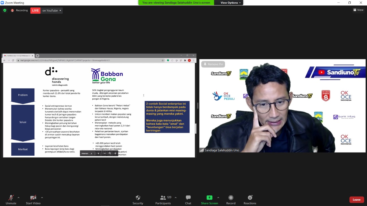 Sociopreneur yakni Sandiaga Uno menyebutkan bahwa selama pandemi Covid-19 ini pertumbuhan ekonomi mengalami penurunan bahkan pada pada Kuartal II-2020 tercatat negatif 5,32 persen, dan pada Kuartal III-2020 berada pada kisaran negatif 2,9 hingga negatif 1,1 persen,